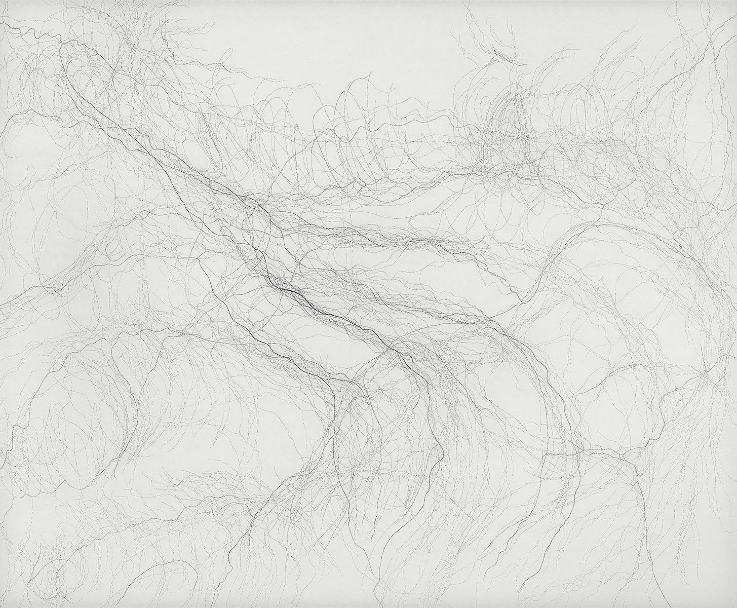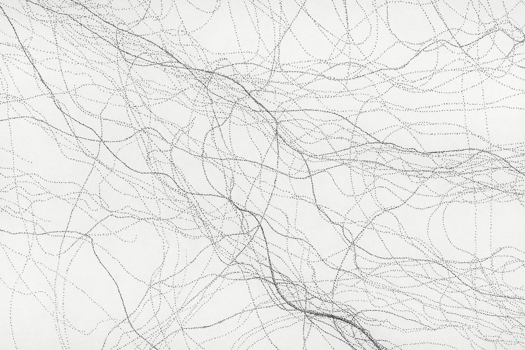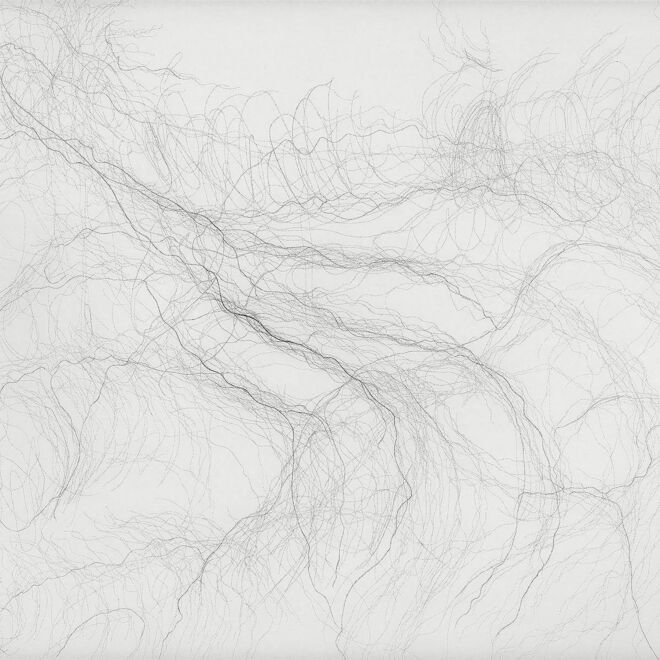 Ihre filigranen Zeichnungen aus kleinsten Buchstaben erinnern an neuronale Netzwerke und Areale des menschlichen Gehirns. Sie basieren auf Skizzen, die sie während Hirnoperationen an der Charité Berlin als Zuschauerin anfertigt.