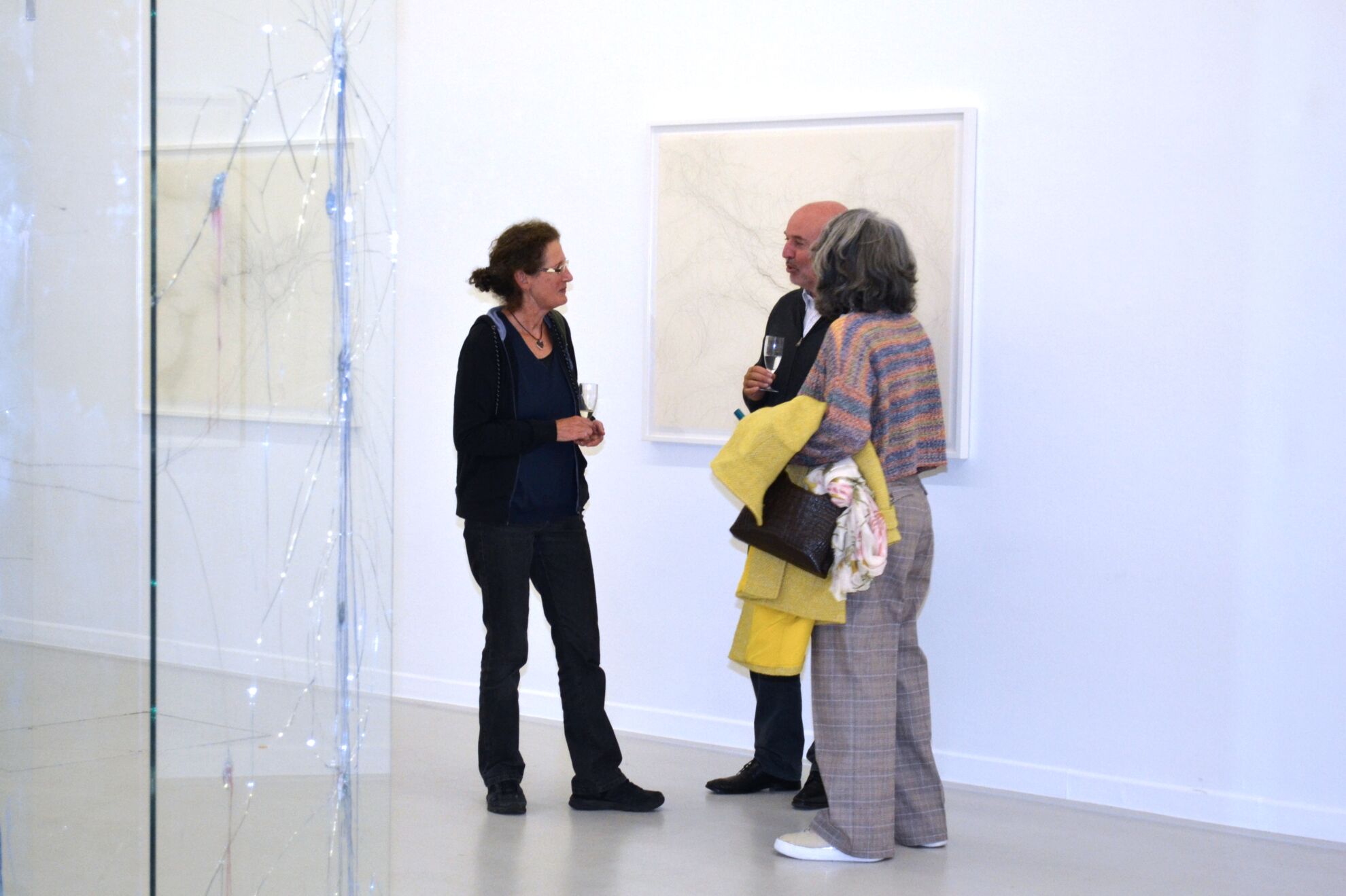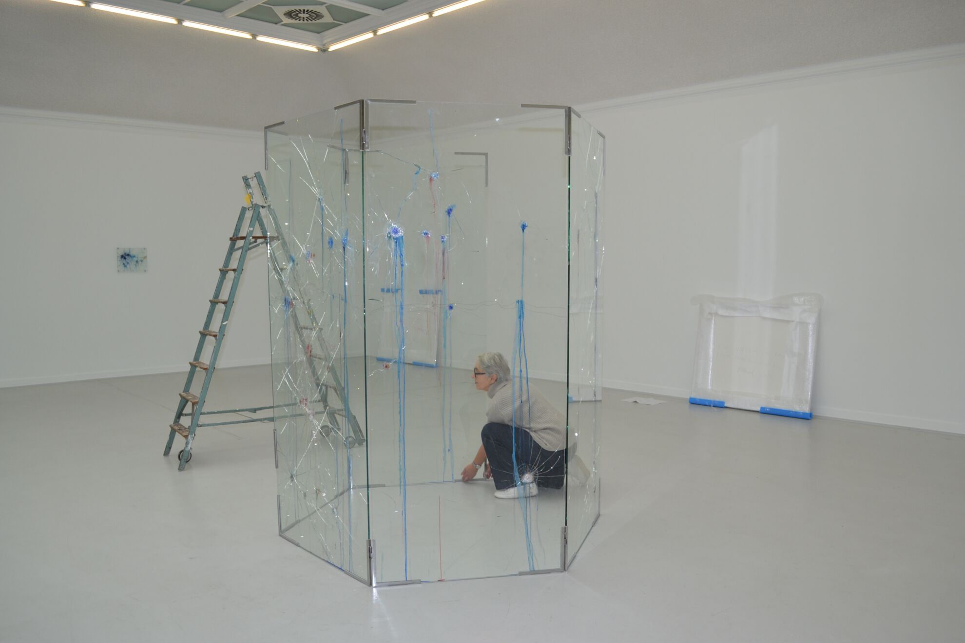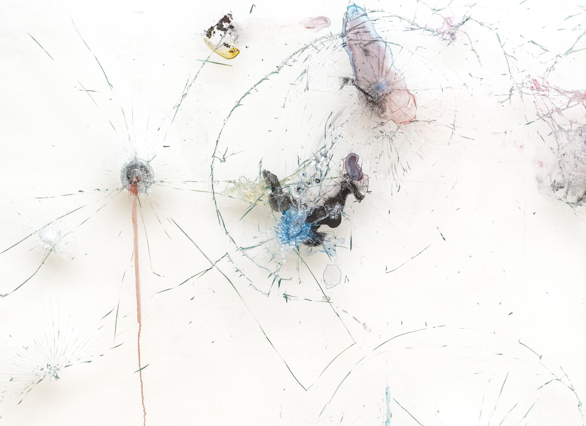 Gewalt und Zerstörung sind auch der Ursprung ihrer Objekte und Installationen aus Glas für den Raum und die Wand. Die bei Demonstrationen zerstörten Panzerglasscheiben dienen der Künstlerin als Grundlage. Das Glas bearbeitet sie mit Farbpigment und Lack. Der kurze Moment des Steinschlags ist noch immanent, erhält durch die künstlerische Bearbeitung jedoch eine weitere Dimension.