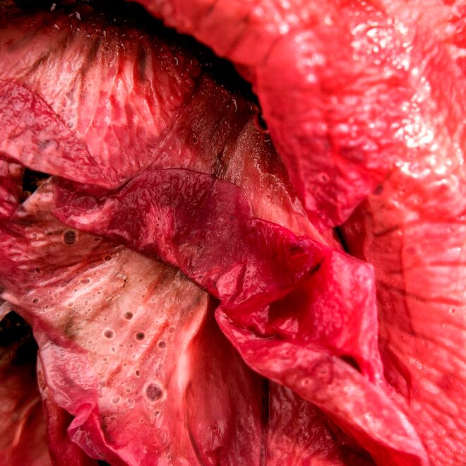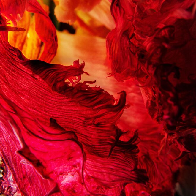 Koelbls poetische Naturbetrachtungen widmen sich den Pflanzen im Moment ihres Vergehens. Die schwindende Fülle lässt die Blüten und Blätter erstarren, morsch, brüchig und schlaff werden. Sie haben ihren Zenit überschritten, doch Koelbls Aufnahmen zeigen, dass die Natur in ihrem unausweichlichen Übergang eine ganz eigene Opulenz aufbietet und erstaunliche Formen und spektakuläre Farben mit betörenden Rottönen hervorzaubert.