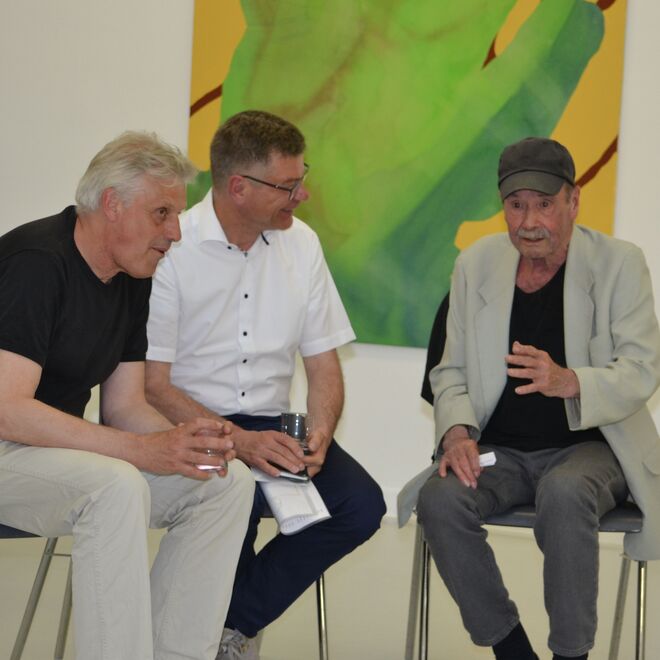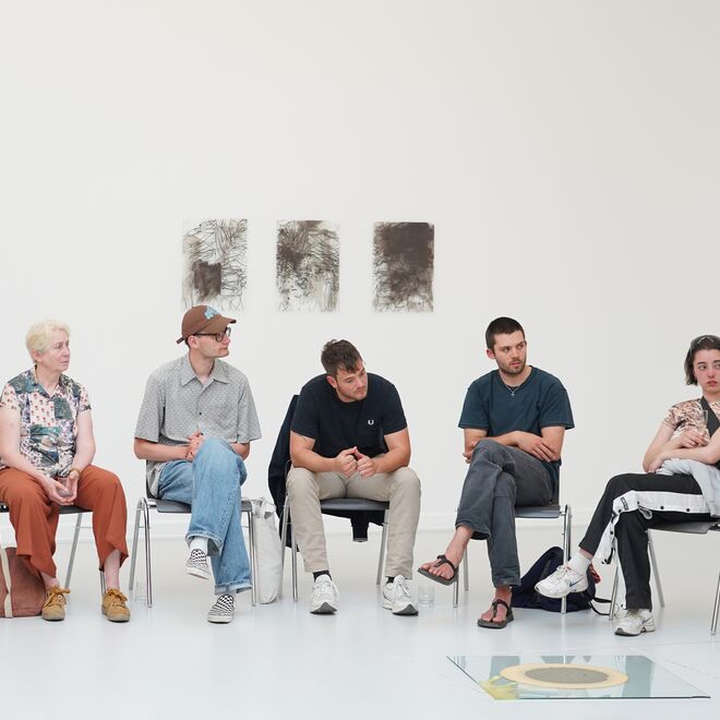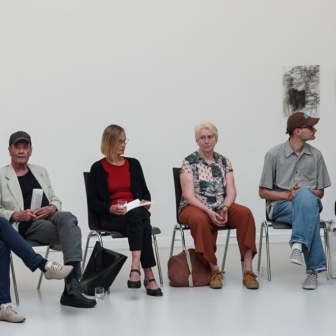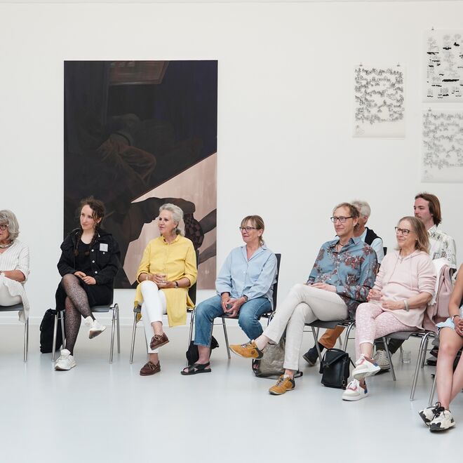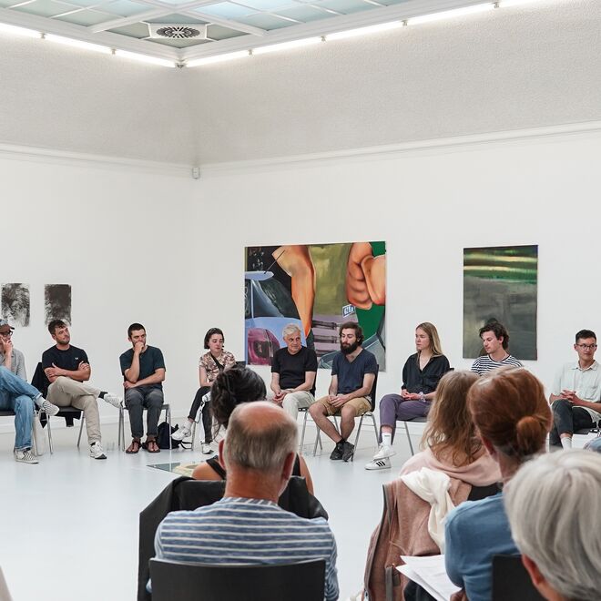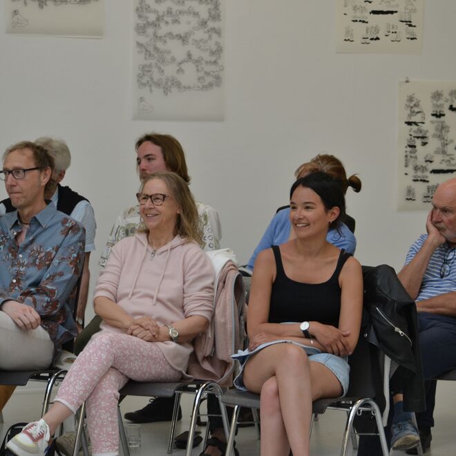 Thomas Bechinger und eine Gruppe der ausstellenden Studierenden geben Einblick in das Studium an der Akademie der bildenden Künste Stuttgart und stellen anschließend bei einem Rundgang Ihre eigenen Arbeiten vor.