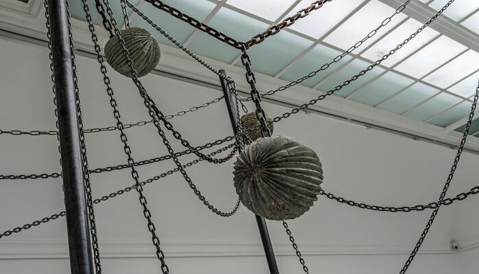 So etwa in der Arbeit „Il Redentore“, bei der runde Lampions, stark deformiert und tiefschwarz, wie verkohlt, von der Decke baumeln und die Raumecke wie den Schauplatz und Überrest einer nächtlichen Party erscheinen lassen. Das Fest ist vorbei, die Gäste gegangen – zurück bleibt nur noch die Spur der Feier.