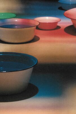 Ihre eigens für den Ausstellungsraum konzipierte Arbeit LLUZI spielt ganz bewusst mit der gläsernen Überdachung des Kunstvereins, die sie zum Teil mit Farbfiltern versieht. Im Zugleich von Dingfarbe und in farbiges Flutlicht getauchte Bodenszenerien durch Projektion macht sie deutlich, wie sehr diese Konstellation die prekäre Präsenz des Bildes zwischen Erscheinen und Verlöschen, Transparent- und Manifestsein unter den Bedingungen seiner medialen Erzeugung zum Thema hat: Die Fensterstruktur wird mittels Tageslicht und Scheinwerfern ein Muster auf die mit klarem oder gefärbtem Wasser gefüllten Schalen zeichnen.