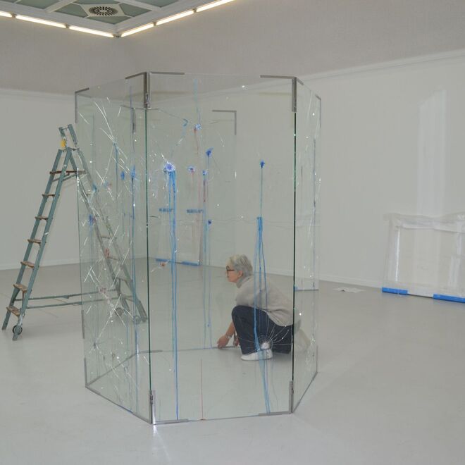Gewalt und Zerstörung sind auch der Ursprung ihrer Objekte und Installationen aus Glas für den Raum und die Wand. Die bei Demonstrationen zerstörten Panzerglasscheiben dienen der Künstlerin als Grundlage. Das Glas bearbeitet sie mit Farbpigment und Lack. Der kurze Moment des Steinschlags ist noch immanent, erhält durch die künstlerische Bearbeitung jedoch eine weitere Dimension.