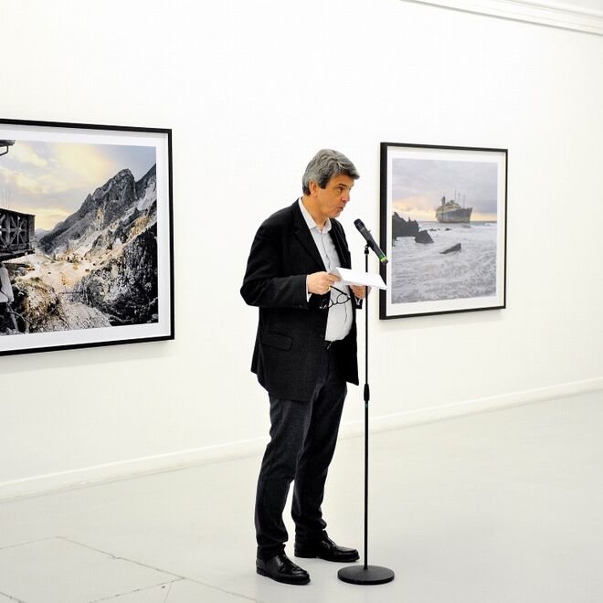 Die Ausstellung, die wir heute eröffnen, präsentiert zwei unterschiedliche Arbeitsweisen von Jörn Vanhöfen. Die großen Tafelbilder in diesem Raum sind ein kleiner Ausschnitt aus dem umfangreichen Zyklus „Aftermath“, für dessen Motive der Künstler von 2005 bis 2010 die halbe Welt bereiste. Bevor sie hierherkamen waren sie bereits in Großstädten wie Hamburg oder New York zu sehen. Die kleineren, um ein zentrales Motiv arrangierten Fotografien, die Sie im Wesentlichen im Kabinett finden, bieten einen dezidierten Einblick in das neueste Schaffen des Künstlers aus den letzten sechs Monaten. Die Aufnahmen entstanden in der Autostadt Detroit und sind in Konstanz zum ersten Mal öffentlich zu sehen. Der Bilderfries im schmalen Flur versteht sich als eine Überleitung von der einen zur anderen Werkgruppe.