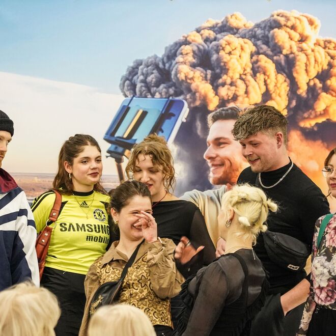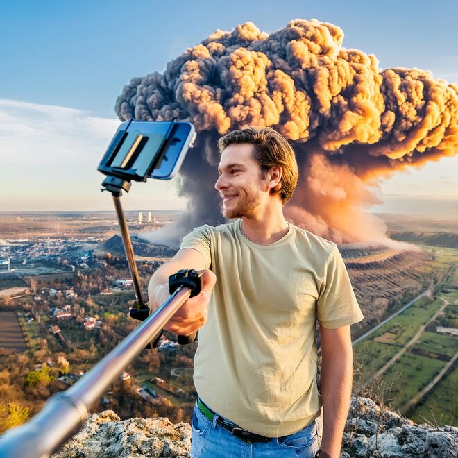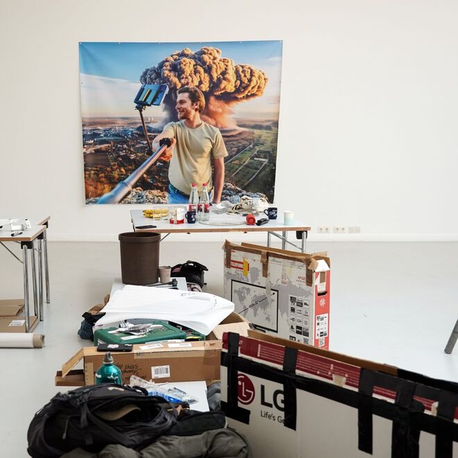 Luca de Marco: “The last selfie on earth”, 2024, UV-Druck auf PVC-Plane, 200 x 250 cm
