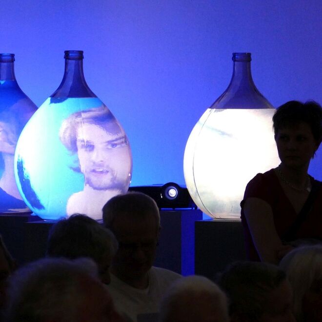 Franticek Klossners Körperprojekten auf Glasflaschen spielen ihrerseits mit diesem körperlichen Innen und Aussen. Die bauchigen Glasflaschen, die normalerweise wohl Most oder einen anderen köstlichen Saft enthalten, sind Träger von Projekten, von Gesichtern, von Augen, von nackter Haut, die das Verletzliche des Körpers zeigen: das Gesicht, die Augen, die Haut.