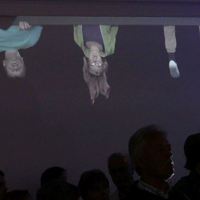 Die Videoprojektion ´“Intruders“ von Anna Anders zeigt architektonische Grenzen auf. Eine Gruppe von jungen Menschen versucht heimlich sich vom Boden aus hoch zu stemmen und von einer Deckenkante hinabzuklettern, wie wenn die Menschen so in ein Bild oder in den Ausstellungsraum gelangen wollten. Auch hier ist die Grenze eigentlich nicht eindeutig: ist es eine räumliche Grenze oder eine Bildgrenze?