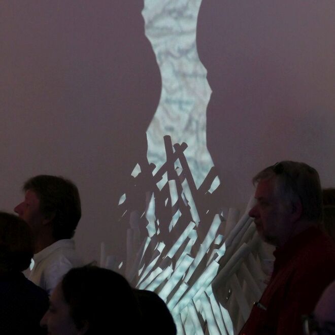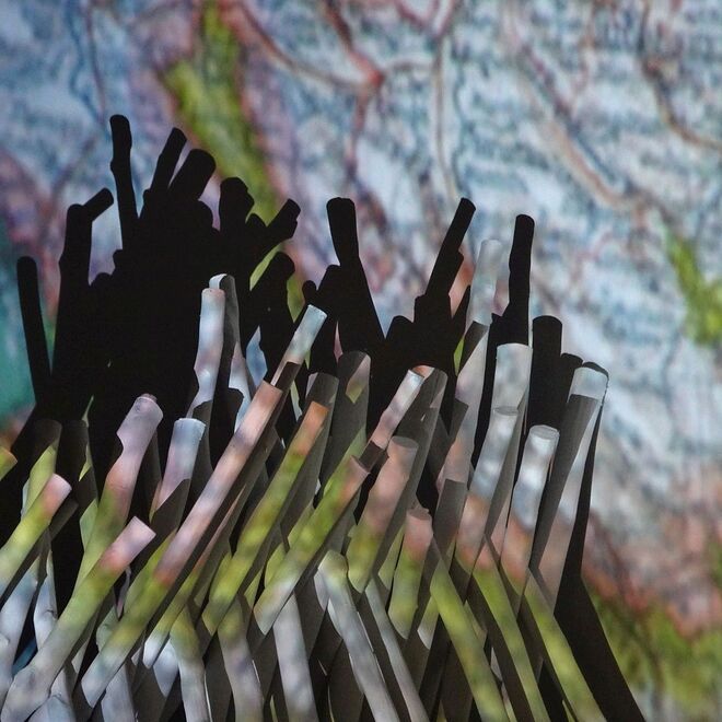 „Anewand“ von maboart zeigt zwar mit dem Schräghaag und der projezierten Karten zwar geographische Grenzen aus dem Atlas. Doch nicht nur diese: Die Grenzziehung mit den Holzstäben zeigt auch auf die Temporalität und Fragilität von Grenzziehung auf.