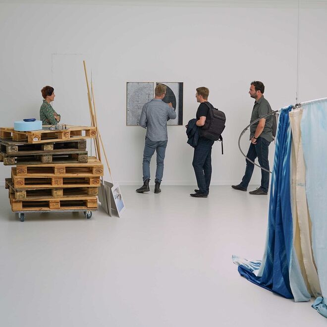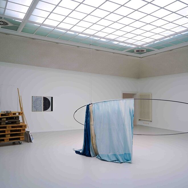 In loser Anordnung zeigen Irena Eden und Stijn Lernout einen Parcours, bestehend aus einer Serie von Zeichnungen, einer raumgreifenden Skulptur aus Stahl und Textil, sowie einer installativen Anordnung von Paletten, Fotografien, skulpturalen Elementen. Die einzelnen Arbeiten bilden ein Gesamtgefüge, welches in seiner abstrakten Anmutung verschiedene Blickwinkel und Deutungsebenen ermöglicht.