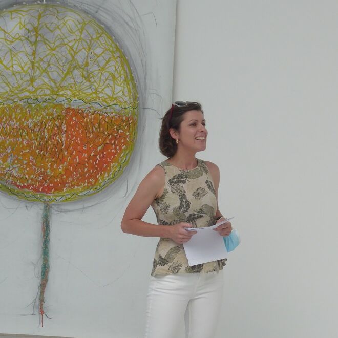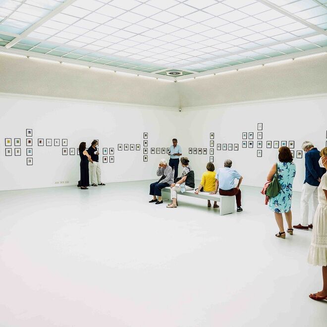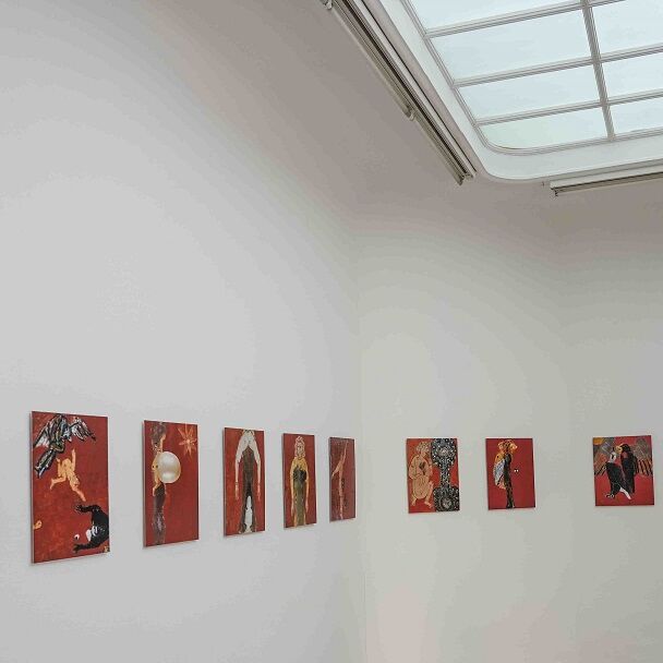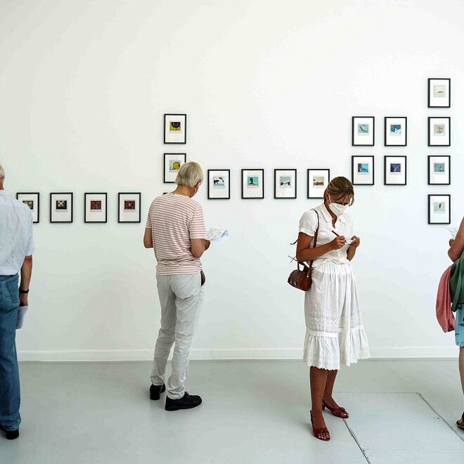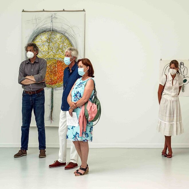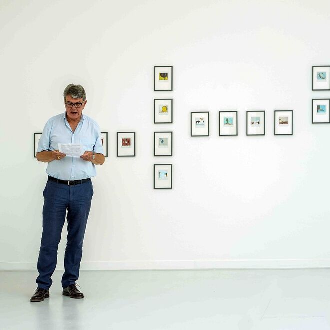 Die kleinformatigen, leuchtend farbigen Polaroid-Transformationen werden in der Ausstellung des Kunstvereins Konstanz in lebhaftem Kontrast zu großformatigen Arbeiten gezeigt, u.a. Kohlezeichnungen, deren prägnant-sparsamer Strich Formen und Figuren leicht und wie improvisiert entwirft.