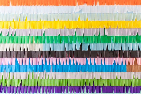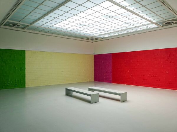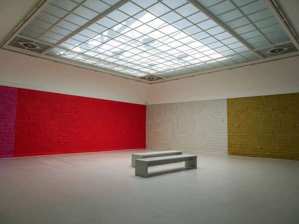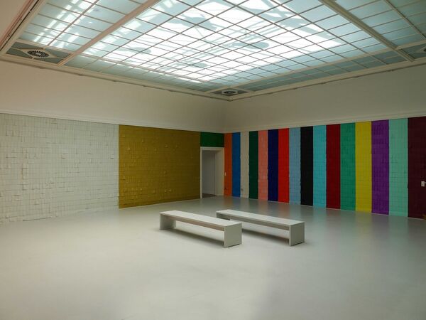 Für den historischen Oberlichtsaal des Kunstvereins Konstanz richtet Katharina Hinsberg eine ortsspezifische Installation ein: in einer die Wand erobernden Arbeit ordnet die Künstlerin vielfarbige Streifen aus Seidenpapier zu einer Schindelstruktur, deren gleichmäßige Lineatur doppelt dynamisch wird: über die Schindelzeilen legen sich zeichnerische Linien. Die Papierstreifen selbst sind so fein am oberen Rand befestigt, dass jede Luftbewegung sie in Schwingung zu versetzen mag. Das Durchscheinen der Farbe der jeweils unteren Reihe, das farbige Aufscheinen der hochgewirbelten Schindeln fügt eine malerische Qualität bei, die die Ausgangseinordnung, es handle sich um räumlich-installative Zeichnung, unsicher werden lässt.