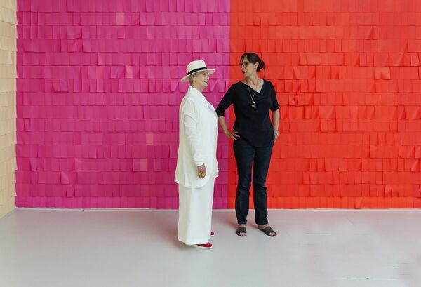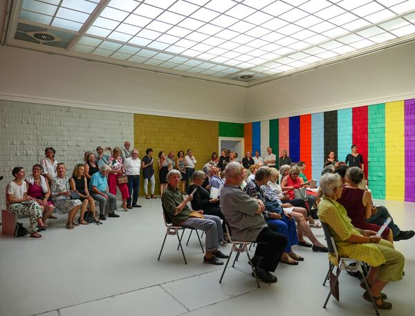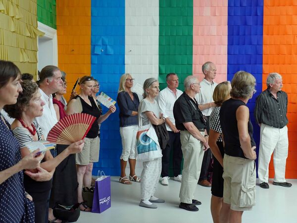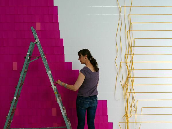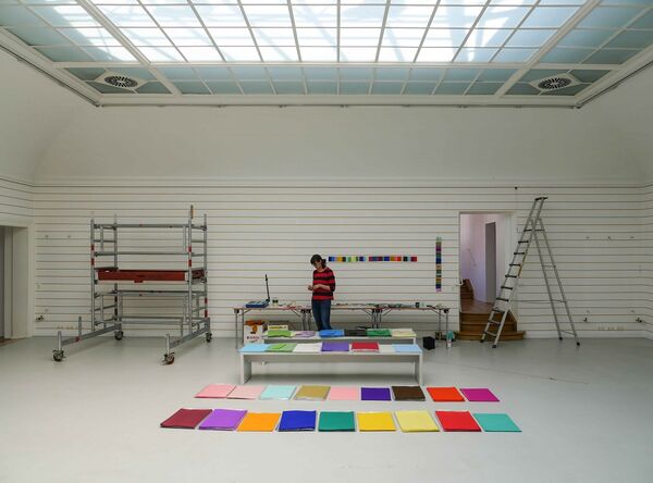 Die Farbauswahl ist dabei gesteuert durch das vorliegende Warensortiment für Seidenpapier, die Abfolgen, die Nachbarschaften der teils so kräftig eingefärbten, teils dezentfarbigen Seidenpapiere aber legt die Künstlerin fest – an einem eigens hergestellten Modell des Kunstvereinssaals wurden erste Farbreihungen erprobt, im tatsächlichen Aufbau aber durchaus verändert.