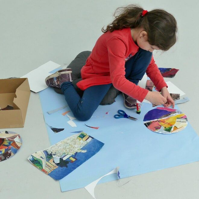 Wir reißen, falten, schneiden, kleben und lassen uns von den Bildern um uns herum inspirieren. Jedes Kind darf in der Ausstellung etwas Eigenes zum Mitnehmen machen und am großen Gemeinschaftswerk mitwirken.
