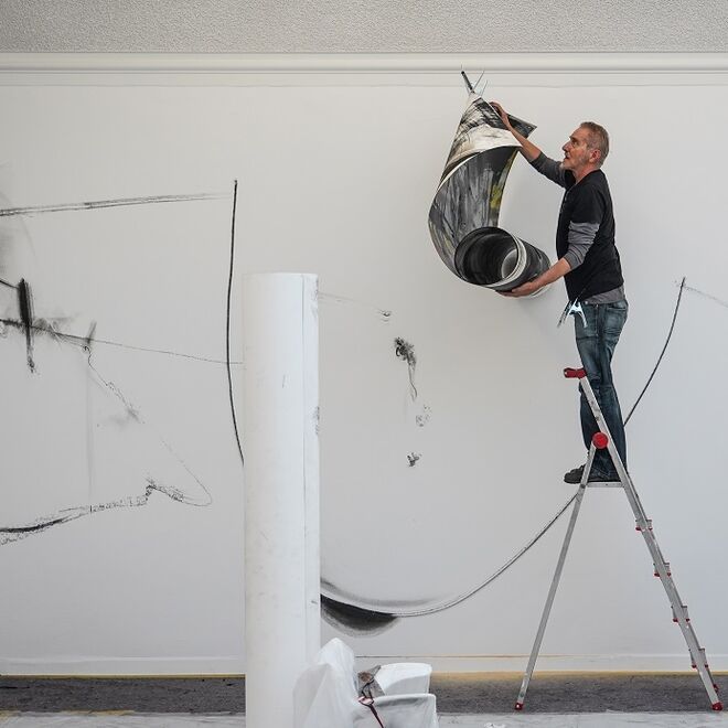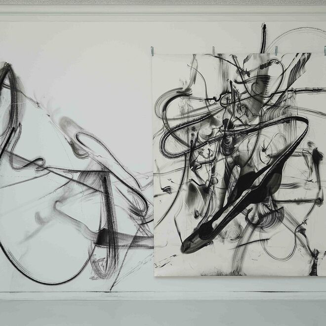 Dazu gehören auch die expressiven Kohlezeichnungen, die er dort direkt auf den Wänden ausgeführt hat, aber nicht als Weiterführung der Strukturen und gesetzten Formen auf den Papierbahnen. Es sind autonome Arbeiten, die mit den anderen Objekten kommunizieren. Oder auch nicht.