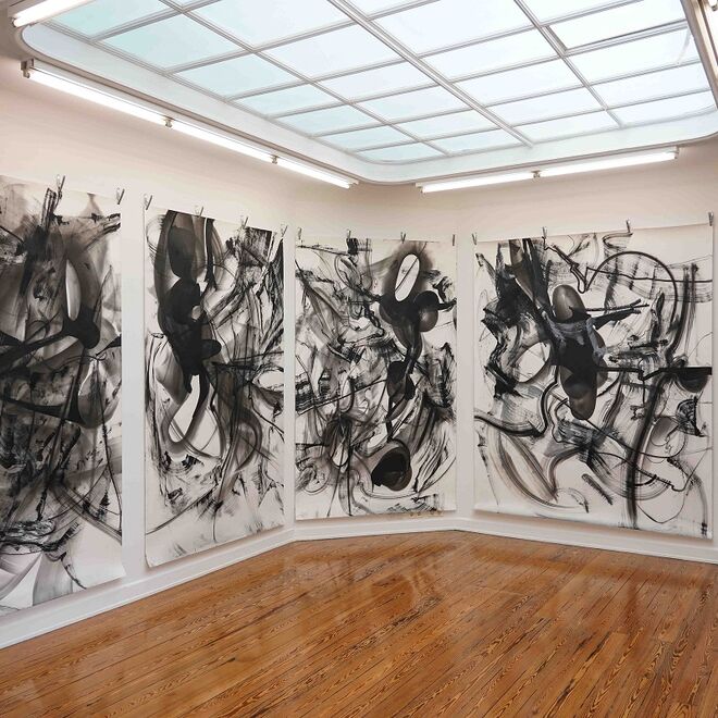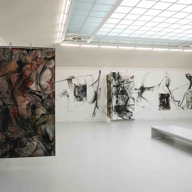 Auch das sind Momente seines künstlerischen Prozesses, eines dynamischen Vorgangs, der letztendlich auch für den Betrachter erlebbar wird, so z. B. in dem kleineren Raum des Kunstvereins. Dort hat der Künstler acht wandbeherrschende, ja raumfüllende Papierbahnen installiert, die er mit schwarzer Ölfarbe und mit Kohle bezeichnet hat - die unterschiedlichen Texturen sind auf der Bildfläche wahrnehmbar. Wenige Farbspuren kontrastieren mit dem hermetischen Schwarz, das sich auf lichtem Bildgrund auslebt.