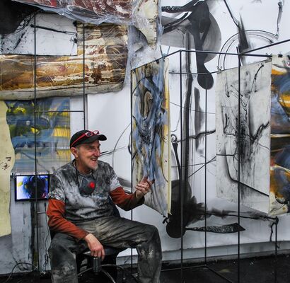 So ist ein Besuch in seinem Atelier immer wieder ein Erlebnis: Großformatige Papierbahnen hängen an den Wänden, einzelne Papiere liegen am Boden oder stehen mittels eiserner Stellagen im Raum, manche Werke sind von einer Ausstellung zurückgekehrt, andere mitten im Entstehen oder werden erneut überarbeitet, vielleicht schon ein 2. oder 3. Mal. Trotz geöffneter Fenster steht ein durchdringender Geruch im Raum, der zunächst lockt, aber für Ungewohnte nach einer Weile etwas auf die Atmung drückt.