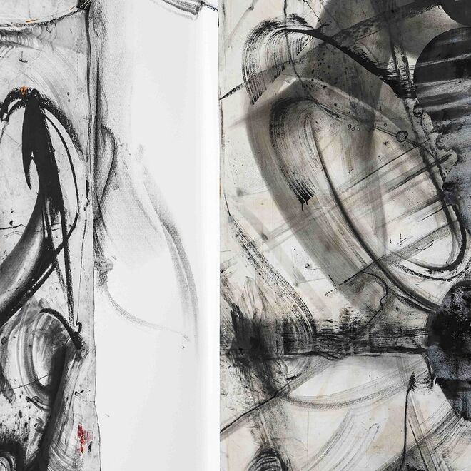 Davor Ljubičić liebt die Zeichenkohle, die, wie er sagt „dicke, satte Spuren“ hinterlässt, „sie quietscht, sie schreit – zerbröselt unter den Fingern. Kohle ist staubig, pudrig. Die Haare werden schwarz, das Gesicht auch. In meinen Bewegungen ähnel ich einem urigen Höhlenbewohner, Höhlenmaler, will aber keine Tiere jagen, nur meine inneren „Dämone“ tanzen lassen.“