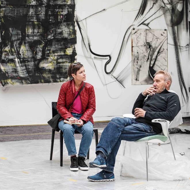 Hemdsärmelig in Arbeitskluft ist Davor Ljubičić bereit, seine Arbeitsgänge weiter zu reflektieren. Neben Grafit, Leinöl, Wachs und Kohle bearbeitet er die schweren Papierbahnen zusätzlich mit Ölfarben und Ölkreiden.