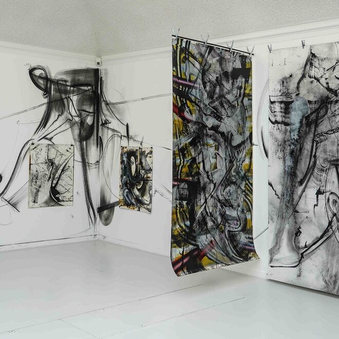 Neben den raumgreifenden großformatigen Papierbahnen hängen dort im Hauptraum weitere Arbeiten unterschiedlicher Formate direkt auf der Wand oder mit Abstand davor. Die Großformate verschaffen seinen Motiven nochmals eine zusätzliche visuelle Dimension und Stärke. Neben reinen Schwarz-Weiß-Arbeiten zeigen sich andere Werke mit spannungsvollen und kontrastreichen Farbkulissen zwischen suggestivem Blau, mineralischem Gelb, gedämpften Rottönen, die mit einem einsaugenden tiefen oder auch verhangenen Schwarz ringen.