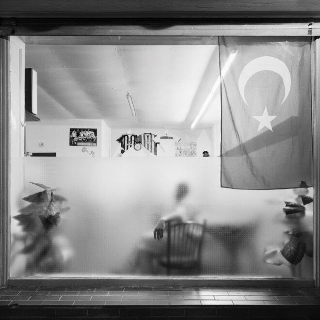 Die Serie „beyond“ zeigt Rückzugsorte für Männer aus arabischen und türkischen Kulturkreisen. Was in den Lokalen hinter milchigen Fensterscheiben vor sich geht, bleibt Außenstehenden verborgen und spiegelt unsere Kenntnis über diese Menschen, die möglichweise sogar nebenan wohnen. Nemes, die als Mädchen durch ihre Flucht nach Deutschland Fremdheit durchlebte, nähert sich ihrem Sujet mit Bedacht. Zunächst fotografiert sie die Räumlichkeiten von außen. Im zweiten Schritt bittet sie Gäste, sich für ein Portrait dicht hinter einem Caféhausfenster zu positionieren. Dabei legt sie den Fokus nicht auf die Männer, sondern auf die Scheibe und schafft äußerst konkrete wie höchst vage Portraits, die zudem die Grenzen des Genres aufzeigen.