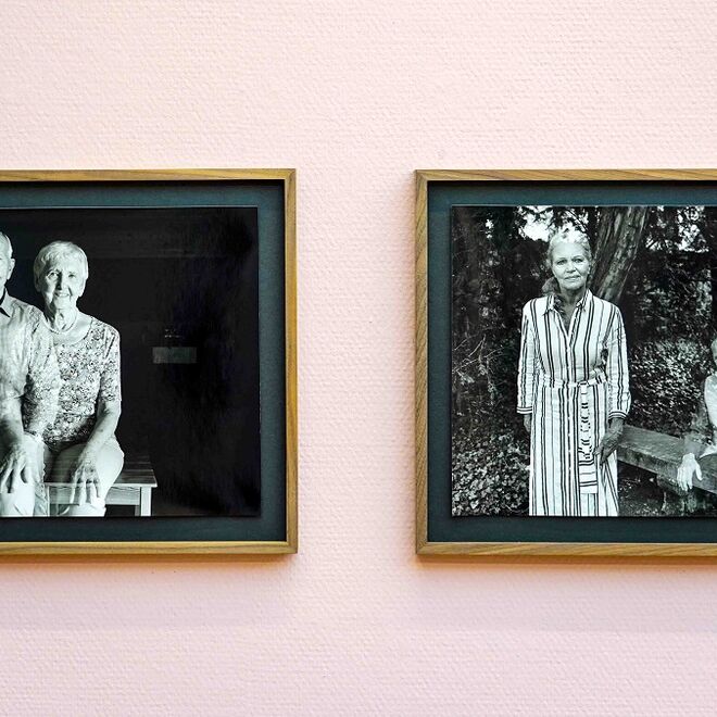 In Ludwigsburg stieß die Zeitungsannonce offensichtlich auf Interesse, wie im Kabinettsaal nebenan, in der Serie Immergrün in Augenschein genommen werden kann. 14 Paare, die seit Jahrzehnten vereint beisammen leben, meldeten sich, obwohl sie aufgrund ihres fortgeschrittenen Alters besonders durch Ansteckung gefährdet waren und zum Schutz abgeschottet, teilweise gar weggesperrt wurden. Es gehörte 2020 somit viel Mut dazu, zum einen einer fremden Fotografin Modell zu stehen und zum anderen zu einer Serie, die die Kraft und Beständigkeit einer langen Liebe in den Mittelpunkt der Betrachtung stellte. Doch Nemes konnte die Paare für sich einnehmen und Vertrauen ist unabdingbar für gute Portraitarbeit. Nemes hatte ein Stipendium von der Stadt Ludwigsburg erhalten und wohnte vor Ort. Sie suchte die Paare einzeln auf und setzte sich in langen Gesprächen mit ihrer Beziehung und ihrer Zweisamkeit, mit ihren Vorlieben und ihrer Gestik auseinander. Erst dann kam die Kamera dazu.