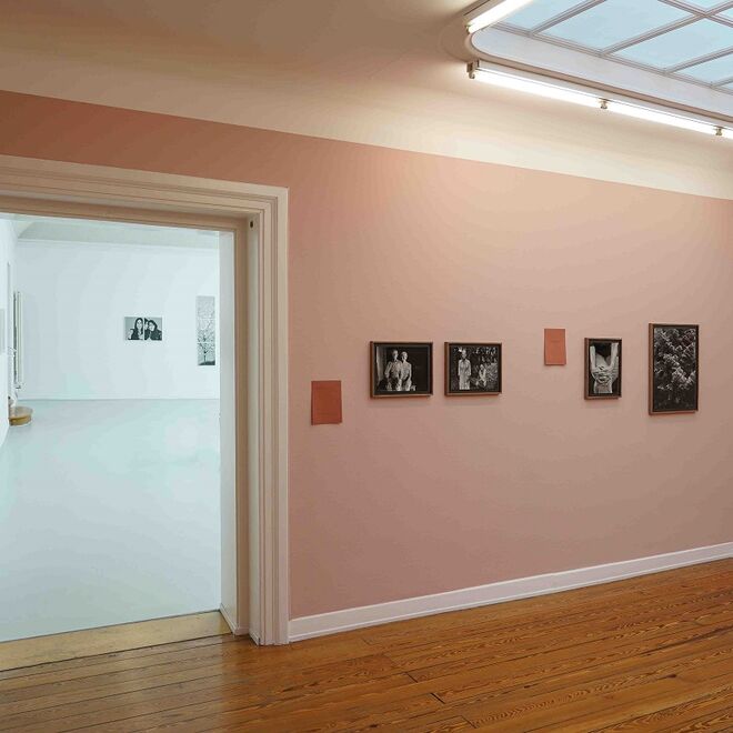 Aus dem seither entstandenen vielteiligen Portraitoeuvre sind im Kunstverein vier wichtige Werkphasen zu sehen. Zu der bereits vorgestellten Serie Immergrün gibt es zweites Werk das veranschaulicht, dass Nemes sich mit dem Mysterium der Liebe schon 15 Jahre früher eingehend auseinandersetzte. Warum Liebe kommt, geht oder bleibt sind Fragen, die sie verstehen und begreifen möchte. Konkret begab sich Nemes für Über Liebe, so heißt die Arbeit, in große Städte wie New York, Madrid, Oslo, Leipzig und Sibiu, den Ort ihrer Kindheit. Dort schlug sie ihr mobiles Studio auf, ein schwerer, neutraler Stoff, den sie an einer Häuserwand montierte. Davor inszenierte sie sich mit einem langen weißen Kleid unverkennbar als Braut und lud wildfremde Passanten ein, den freien Part neben ihr als möglichen Bräutigam einzunehmen. Nur wenige Männer lehnten das Angebot der attraktiven Braut ab, aber sie näherten sich ihr sehr unterschiedlich. Manche reichen ihr die Hand, andere knieen nieder, wieder andere umarmen sie heftig, heben sie hoch in die Luft oder tanzen mit ihr. Insgesamt 35-mal spielte Nemes die suchende Braut. Sie hatte schlotternde Knie, als sie den jeweils angenommenen Partner nach der Liebe zu einer Frau befragte. Bilder dieses Zyklus finden Sie im Flur meine Damen und Herren. Nemes agierte auf den emotional aufreibenden Aufnahmen als Fotografin, Regisseurin und Modell zugleich. Ihre Performance basiert auf einem realen Hintergrund, denn das Kleid ist das Relikt einer gescheiterten Hochzeit. Die Begegnungen hielt die Künstlerin mit der Kamera fest und die teils sehr intimen Antworten der Männer zeichnete sie auf. Nemes sieht sich nicht selbst in diesen Bildern, zwar ist sie zweifelsfrei die abgebildete Braut, aber die Erzählungen und Gesten gelten nicht ihr, sondern der nicht sichtbaren Liebe ihrer hypothetischen Bräutigame.