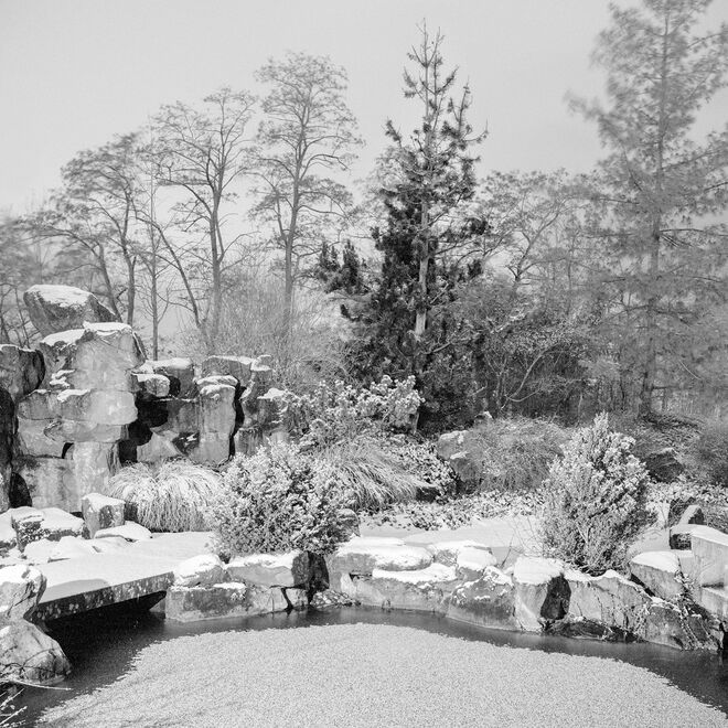 Den Moment zwischen fotografischem Bild und Abbild markiert auch die Arbeit Rock Point I & II von Tino Kukulies. Die in der Wüste der Navajo Nation aufgenommenen Steinformationen sind mit Bedeutung aufgeladen. Sie sind einerseits lebenswichtige Orientierung und andererseits symbolträchtige Begegnungsstätte. Was genau wir in fotografischen Bildern sehen, ist eine Thematik, der Johannes Ocker in seiner fünfteiligen Arbeit Dioramen nachgeht. Ocker zeigt uns Schwarzweißbilder von Gärten, deren Wirklichkeit wie auch Dimension er durch seine fotografische Herangehensweise jedoch in Frage stellt.