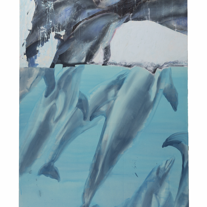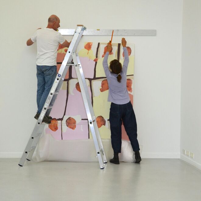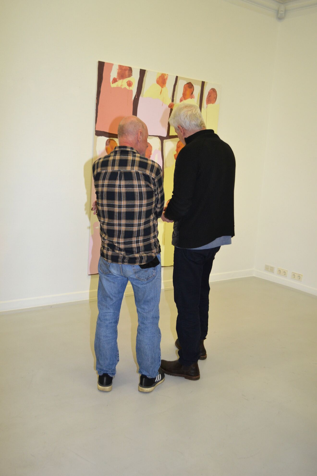 Details werden in einer Vergrößerung herangezoomt, die zu einer abstrakten Lesung verleitet und erst bei genauerer Betrachtung figurative Elemente entdecken lässt: die Pumpenkonstruktion am Euter einer Milchkuh. Eine assoziative Deutungshilfe bieten die Bildtitel, in der Ohne Titel-Gegenwartskunstwelt ebenso ungewöhnlich wie amüsant: eine Reihe kreisrunder, sandigfarbener Flächen mit schlierigen Tupfern in Heidelbeerviolett heißt „Dr. Oetker“, die Darstellung eines Fußes im roten Sportschuh, der die weiße Markierungslinie vor großer Sandfläche leicht überschreitet, ist mit „now jump – no jump“ bezeichnet.