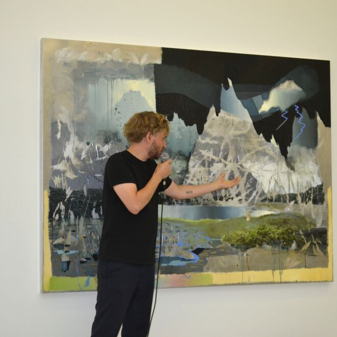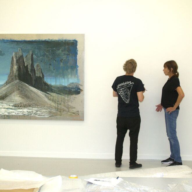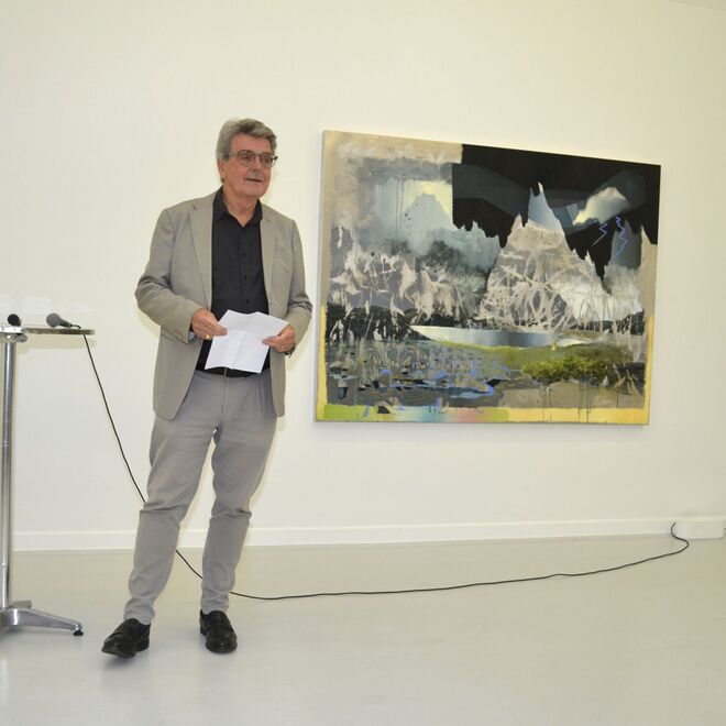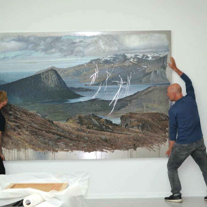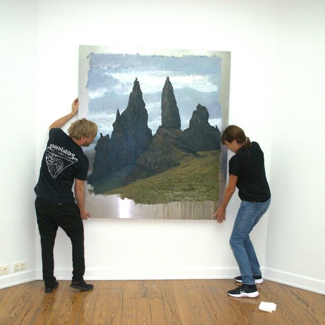 Seine Landschaften, die er auf teils großformatige Aluminium-Tafeln setzt, verharren nicht in naturnachbildender Schönheit. Vielmehr werden sie heftigen, schnell vollzogenen Eingriffen unterzogen, Kratzspuren, wilden Lineaturen, bei denen der metallene Bildgrund freigelegt ist, Licht zurückwirft, den Bildraum spiegelt – und Ferne, Schroffheit, aber auch Verletzlichkeit der dargestellten Landschaft eindrücklich zeigt und fühlbar macht.