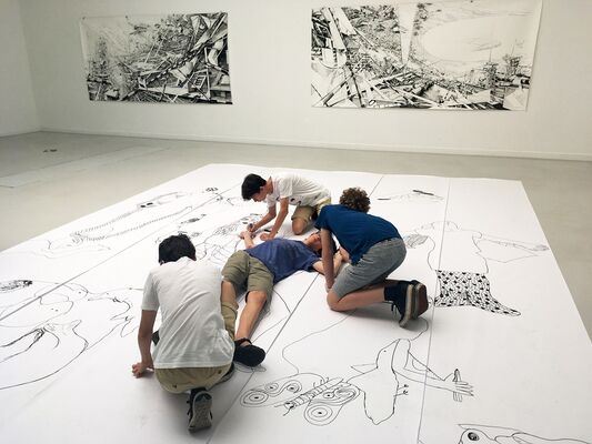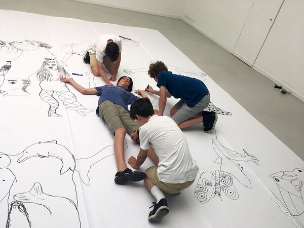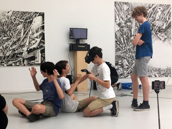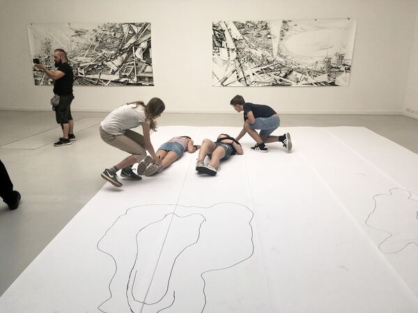 In diesem Workshop wurden analoge und digitale Körperzeichnungen entwickelt, bei denen mit dem Zeichenstift auf Papier und parallel dazu per Controller in der virtuellen Realität die Formen und Körperbewegungen in das jeweils andere Medium übertragen wurden, um dort eine entsprechende Abbildung zu finden. Die Handzeichnungen wurden körperlich erfahren und andererseits konnte durch die VR-Brille beobachtet werden, wie der Körper sich „materiallos“ dreidimensional aufbaut.